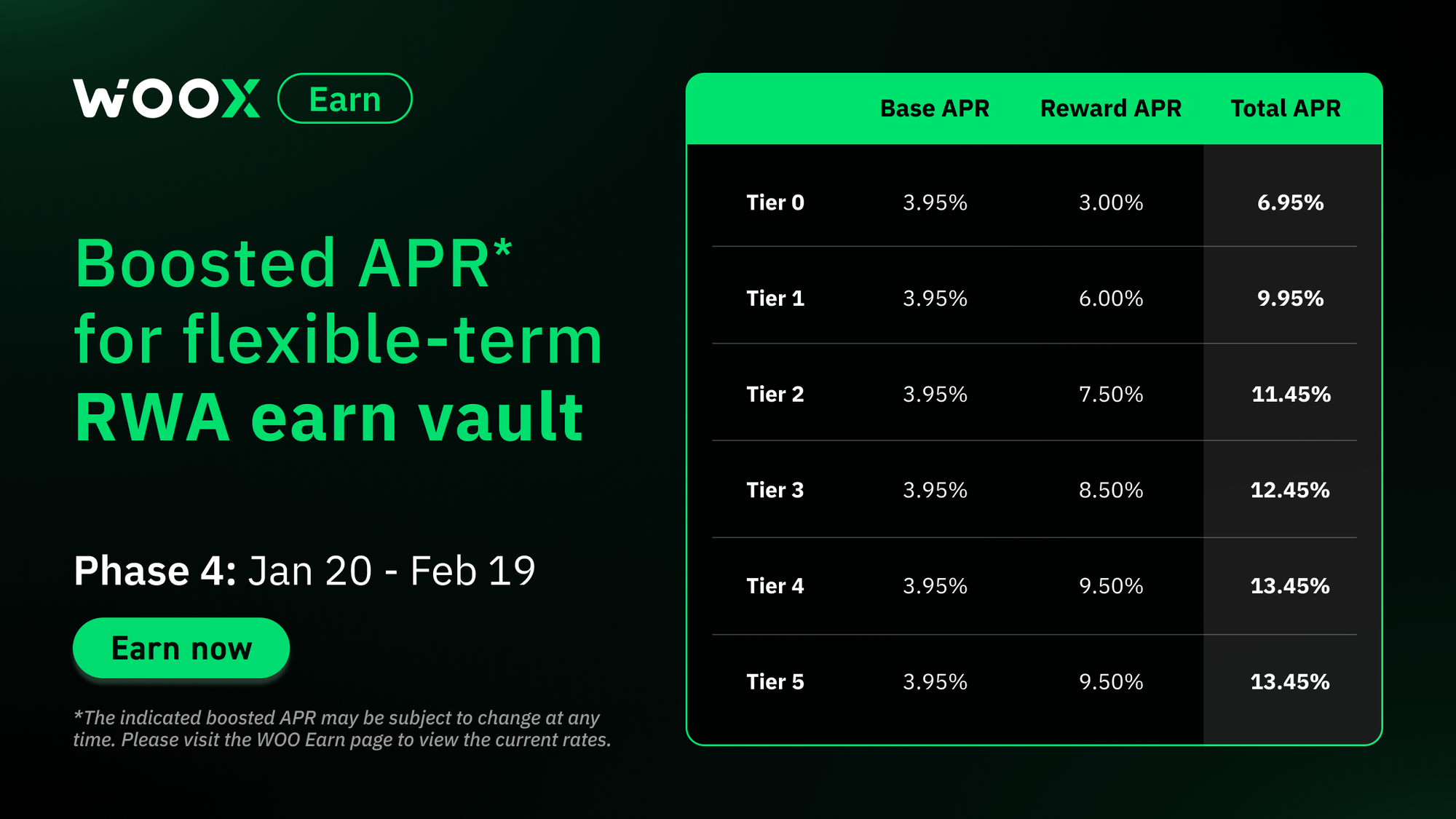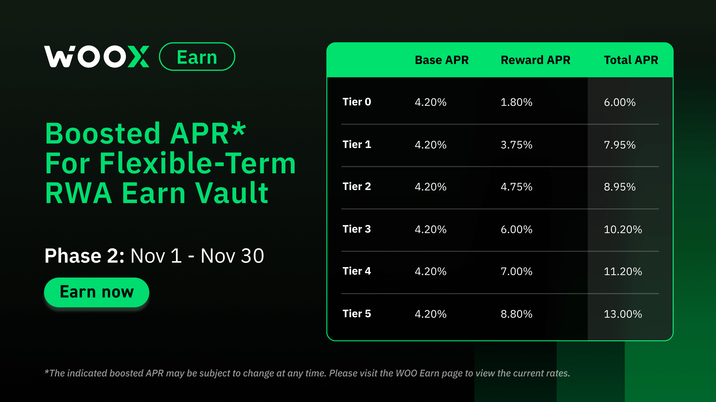 • Rule: Subscribe to the real world asset (RWA) flexible term vaults on WOO Earn, and enjoy boosted APR based on your staking tier.