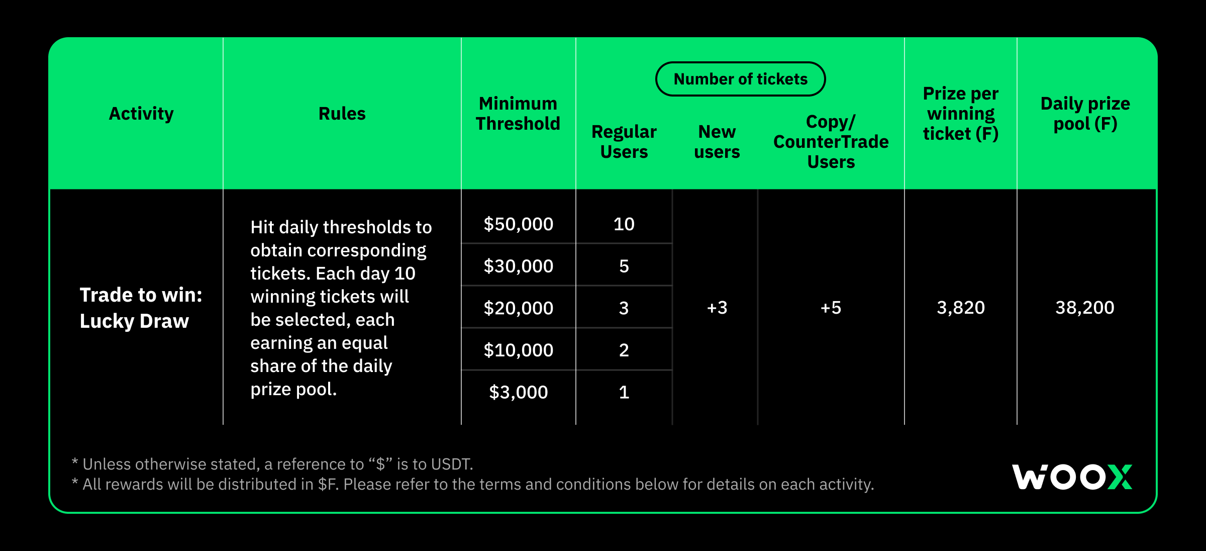 - New User Bonus: Users making their first trade on WOO X during the campaign will receive 3 bonus tickets on the day of their first trade.