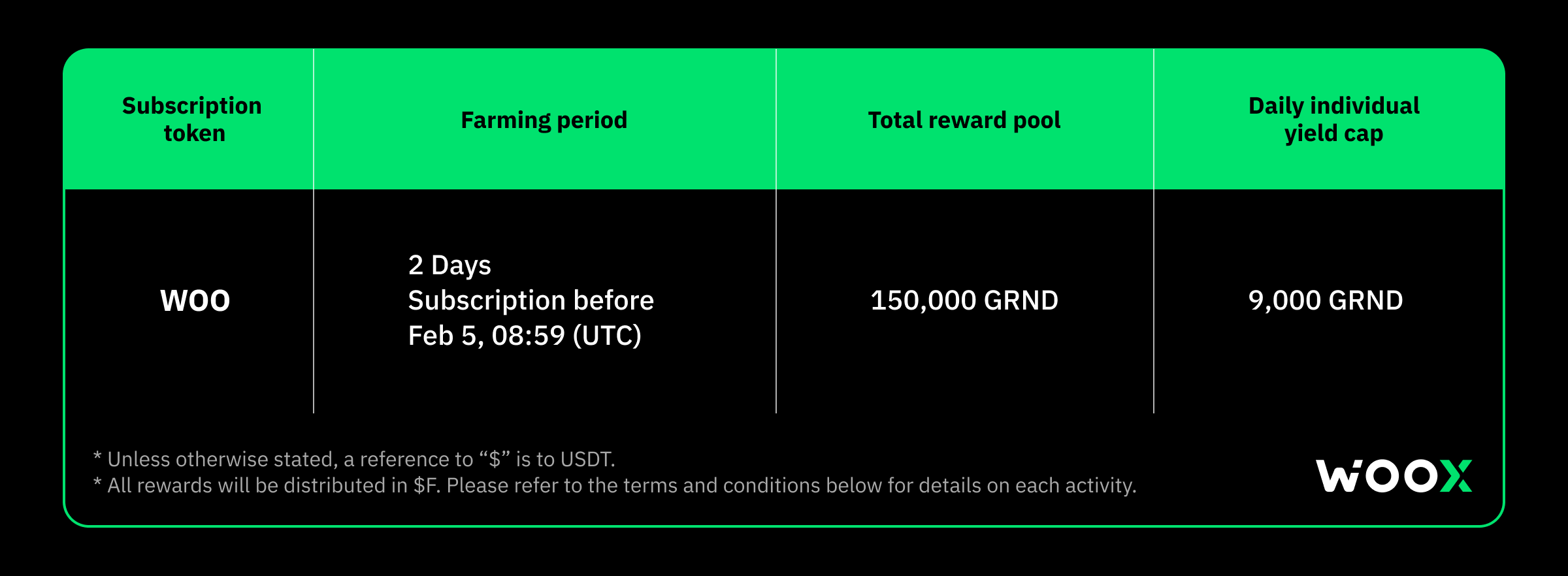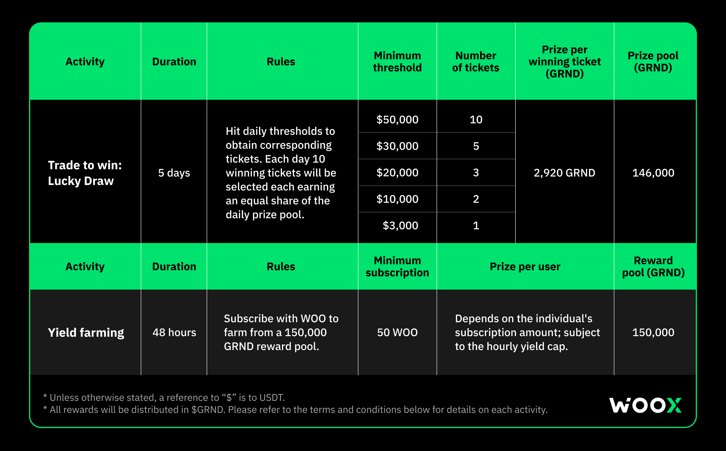 - Subscribe to GRND yield farming vault with WOO to farm yields from a massive 150,000 GRND prize pool. All yields will be distributed in GRND.