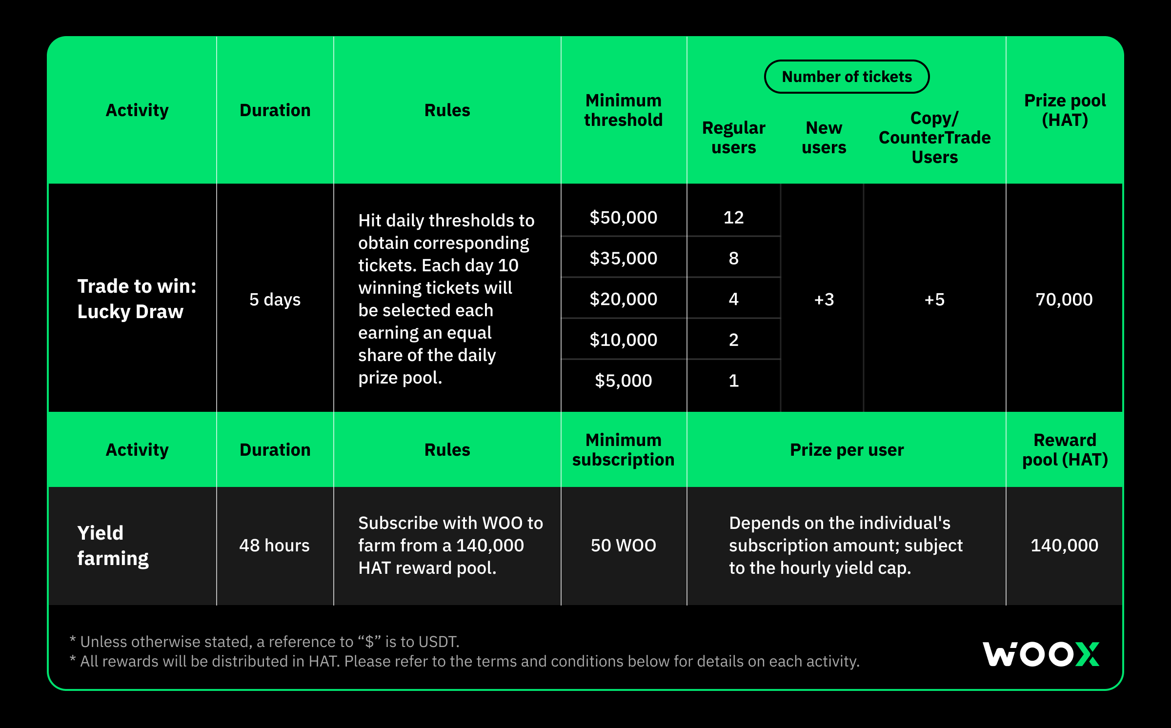 - Social Trading Bonus: Users who allocate at least 100 USDT to a Copy/CounterTrade Position on WOO X Social Trading during the campaign will receive 5 bonus tickets starting from the day the allocation is made.