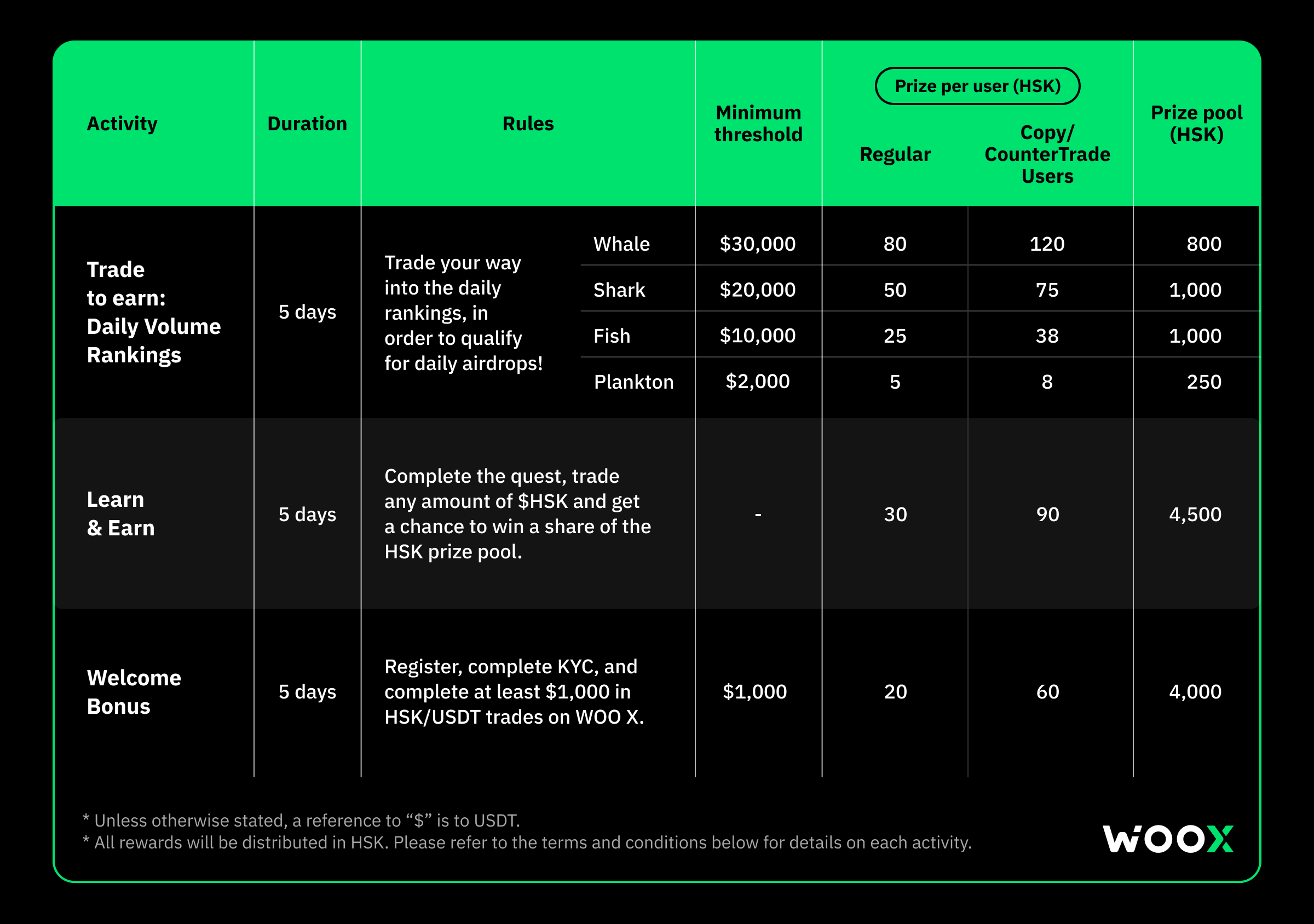 - Participants can win once per day, based on the ranking of their total HSK/USDT trading volume accumulated within that day.