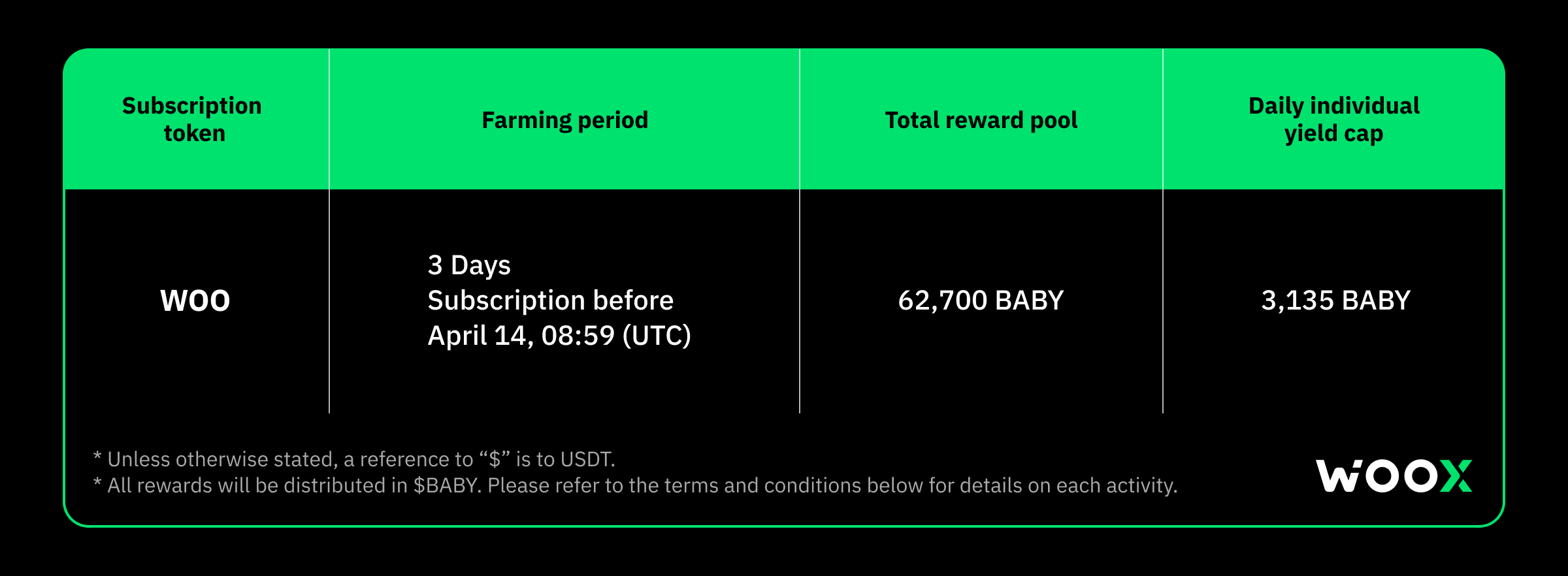 - Subscribe to BABY yield farming vault with WOO to farm yields from a massive 62,700 BABY prize pool. All yields will be distributed in BABY.