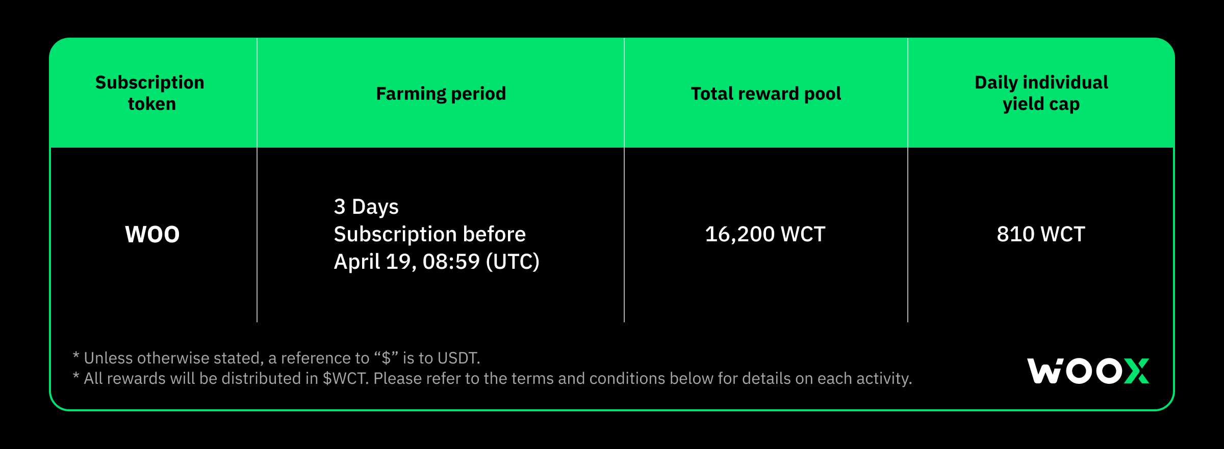 - Subscribe to WCT yield farming vault with WOO to farm yields from a massive 16,200 WCT prize pool. All yields will be distributed in WCT.