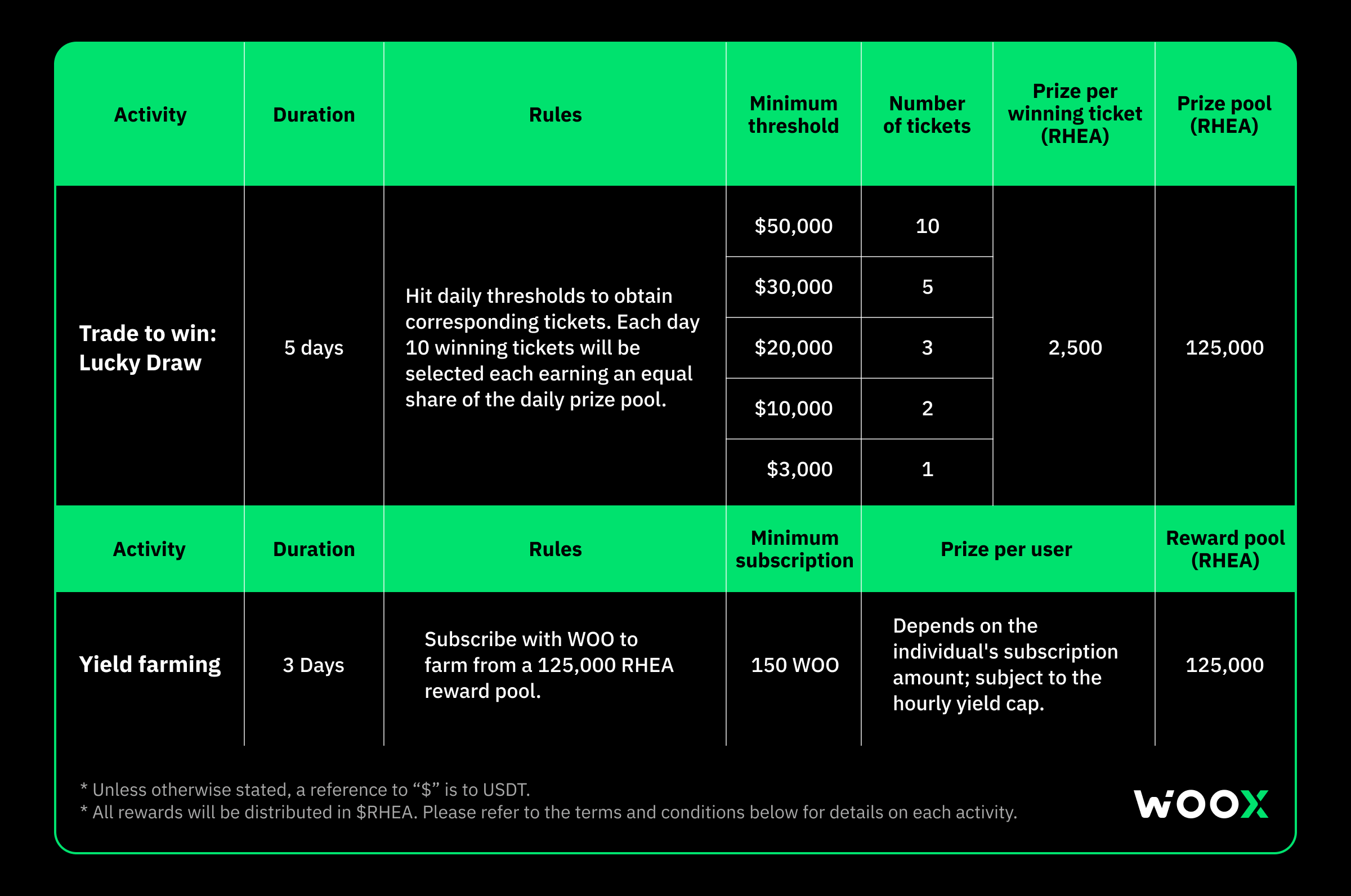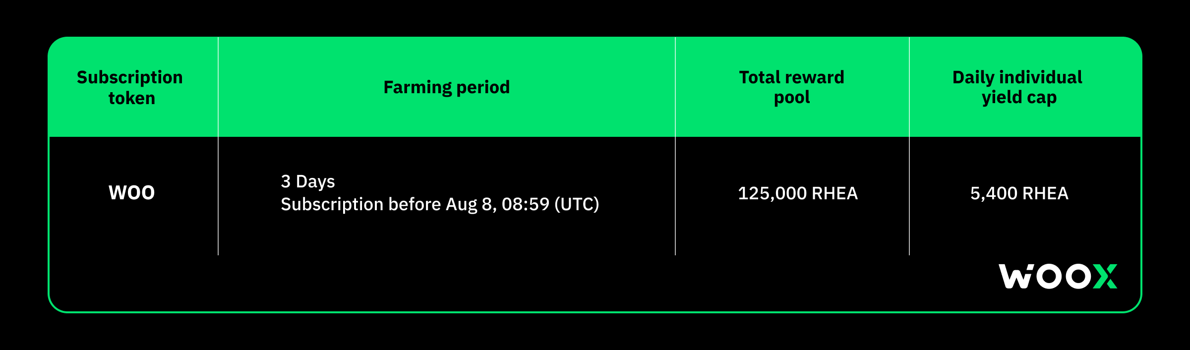 - Subscribe to RHEA yield farming vault with WOO to farm yields from a massive 125,000 RHEA prize pool. All yields will be distributed in RHEA.