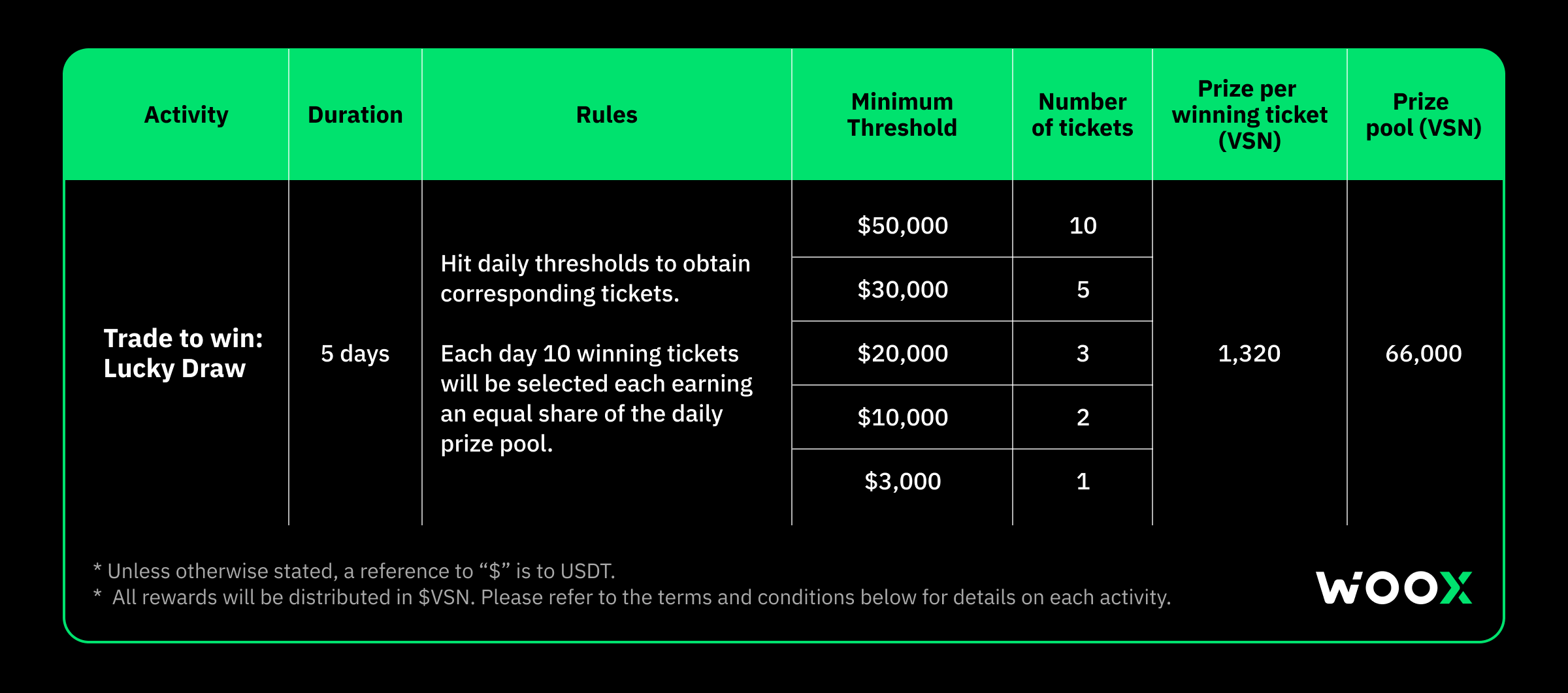 - Tickets are awarded based on the specific threshold met for each tier, and are not cumulative across tiers. Achieve minimum thresholds in VSN/USDT volume to win the corresponding amount of tickets for each tier.