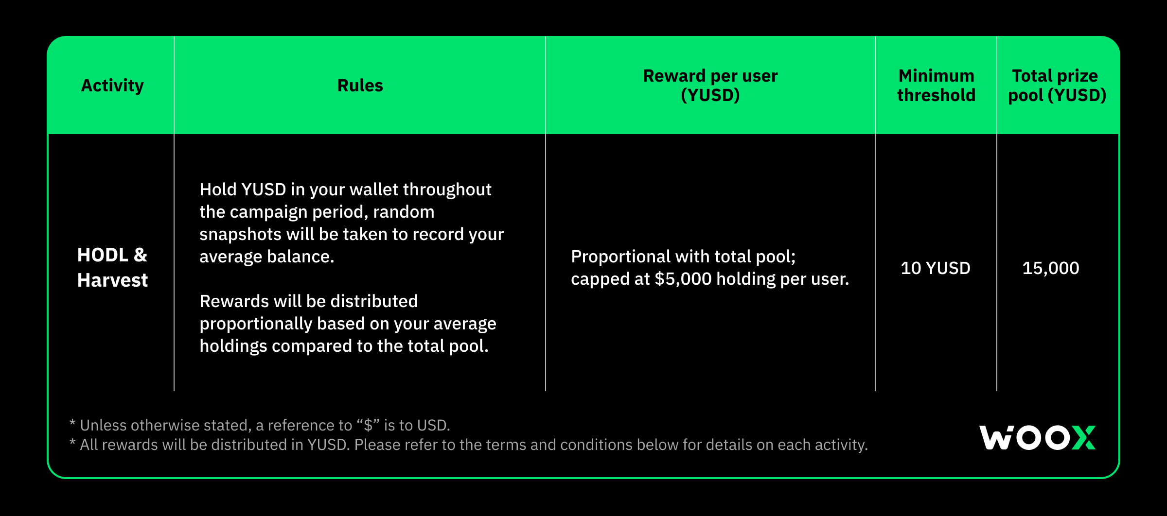 - Minimum holding requirement is 10 YUSD to qualify for rewards. Maximum eligible holding per user for reward calculation is capped at $5,000 YUSD.